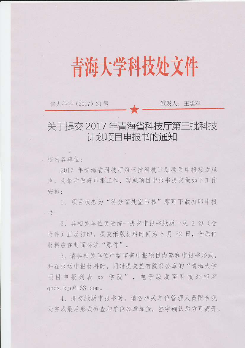 关于提交2017年青海省科技厅第三批科技计划项目申报书的通知