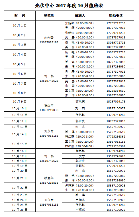 光伏中心2017年度10月值班表